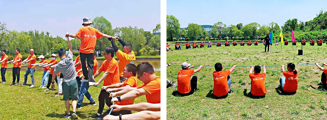 熱身完成之后,團體游戲動力轉圈也隨后而來,我們手拉手圍成一個富有張力的圓環,像極了我們在工作中團隊中的共同平臺,一個人的力量是渺小的,共同的力量是巨大的,六百個轉圈在大家高昂激情的口號中也輕松的完成了。之后教練加大了游戲的難度,由四隊各出一名成員站在麻繩上繞著走一圈,這極大的考驗了團隊協作的能力及互相之間的信任。選出的成員在上面走的同時,下方的同事會鉚足了勁努力往后傾著身子,為了讓繩子緊實的同時更加穩固,通過這個活動讓我們明白了我們是一個團隊,是一個值得彼此信賴的團體。